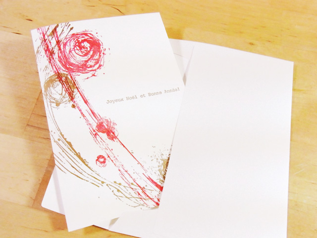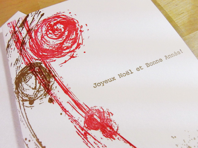 書のグリーティング(LUFTKATZE + Yukako.M) Nenga / Greeting 書で描かれたモチーフをコラージュしたグリーティングカード。 書の「和」をいままでと違ったカタチでデザインしたものになり、活版によって、書が違う顔を見せています。 表面の言葉はフランス語。 クリスマスと年始の挨拶の言葉が入っています。 紙は柔らかめの新・鳥の子を2つ折りにし、パールの封筒つきです。 LUFTKATZE + Yukako Matsui についての紹介→