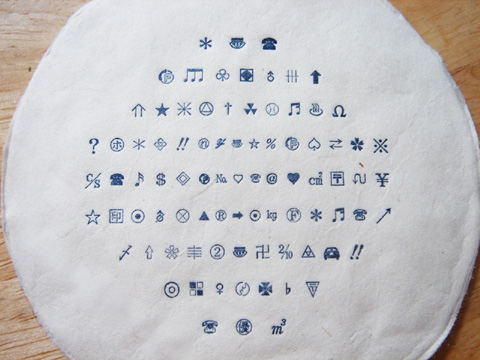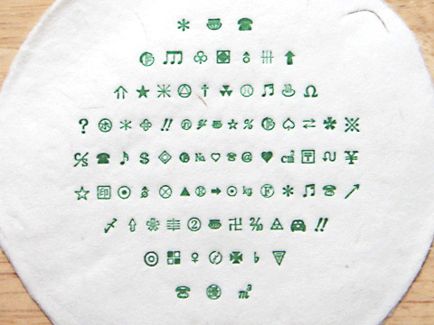 約物活字コースター Sold out! サイズ:約直径85mm 色:1色づつ(墨、草、藍) 紙:和紙 使用書体:6pt〜9pt 印刷機:手きん デザイン/組版/印刷:デザイン:平川珠希 Tamaki Hirakawa(LUFTKATZE design)