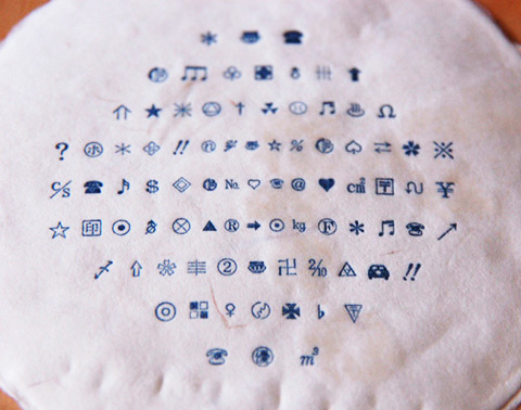 約物活字コースター Sold out! 郵便マークや電話マーク、句読点を含めて「約物」と言います。見慣れた判らないものまで、色々な約物を集めてみました。一番外枠から9pt、8pt、6ptと小さくなっていきます。インクは水がついても滲むことはありません。和紙も強度がありますので、安心して使えます。色は墨、草、藍の3色。
