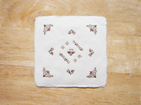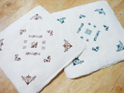 花形活字コースター 花形シリーズとして、新たに和紙のコースターにしました。紙は「和」ですが、モチーフはアンティーク調に色も茶と青銅の2種類。レンガ色は中心に蝶を入れ、青銅は中心に花形罫の角を組み合わせて形にしました。活版インクですので、水に濡れても滲みません。今では手に入らないイワタ活字の花形と、中村活字の花形を使用しています。1枚づつのセットになります。