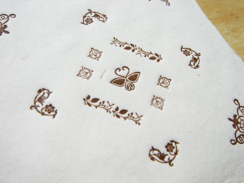 a-レンガ色/蝶 四方に初号の花形、中心の蝶に向かって異なった花形を使用しています。和紙を使っていますが、アンティークな色合いでレンガのような赤茶です。