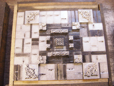 制作ばなし 約物コースターを○で作り、四角の紙もあったので花形で作ってみることに。初めは1回刷りに刷る予定だったのですが、不意に斜めの方が面白いのではと試したら、良い感じに出来たので2回刷りにしました。その後試行錯誤を重ね、一回刷りになるよう組み直し。組み方は内緒です。