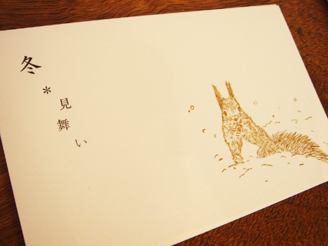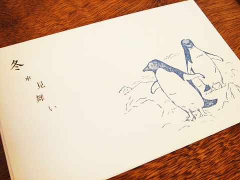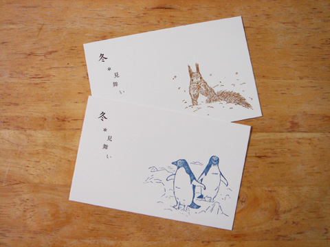 冬見舞い リス/ペンギン ※リス再入荷!(2013年版より横143mmにサイズ変更となりました) 冬の間、いつでも送ることの出来る「冬見舞い」。寒中見舞いの代わりにもなります。絵柄は「エゾリス」と「アデリーペンギン」。どちらも寒い雪の多い冬に生きる動物たちです。