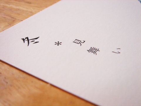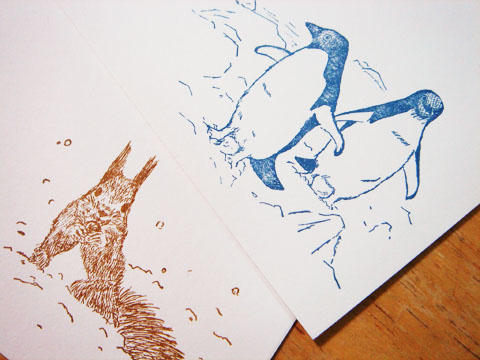 冬見舞い リス/ペンギン サイズ:横148mm、縦90mm(2013年版より、横143mm、縦90mm) 色:2色刷り 紙:タケバルキー 使用書体:明朝/正楷書 印刷機:手きん デザイン/イラスト/組版:Tamaki.H(LUFTKATZE) 印刷:LUFTKATZE 活版室