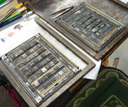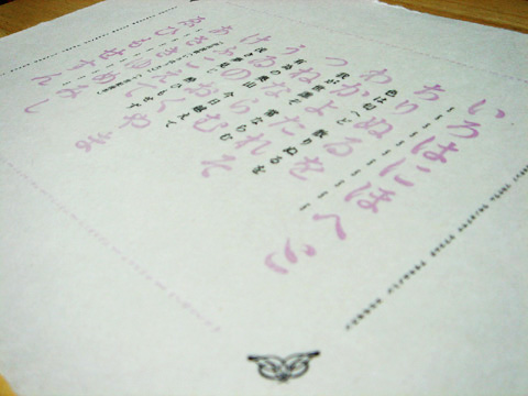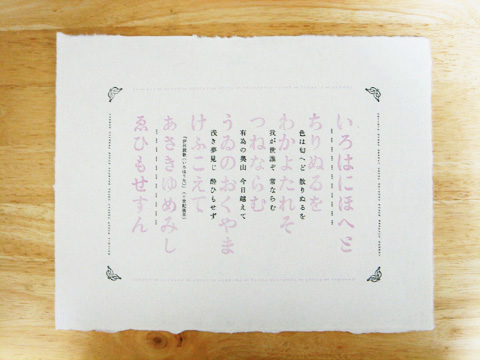 いろは歌(手習い歌) 手習い歌とは、仮名47文字を全て使って一つも同じ文字を使わず作られる七五調の歌。その代表が「いろは歌」でこの規則沿った歌では完璧なものと言われています。日本語の活字で一番大きいものは「初号」の42pt。なかなか文字が揃っている活版所は現在少ない中、仮名のみ一文字づつ揃ったため、全ての文字を使える「いろは歌」で作成しました。迫力ある初号の周りは6ptと8ptのカタカナいろはが囲んでいます。訳である「色は匂へど〜」を行間に入れて刷る2版。色を逆にしての2枚組みです。
