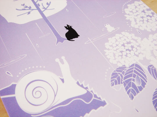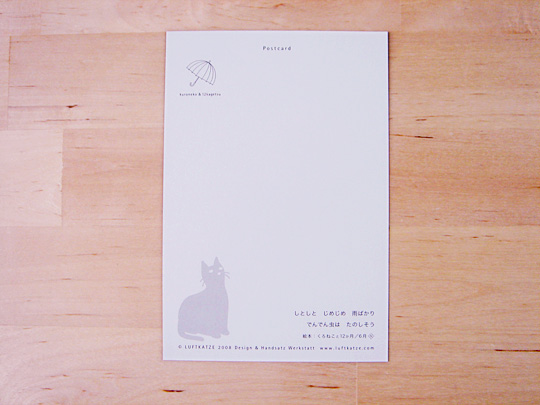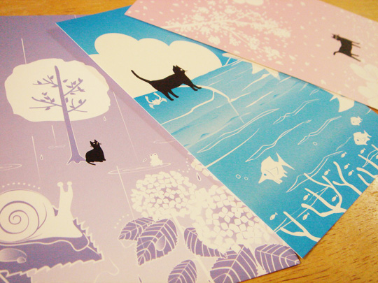 くろねこと12か月 ポストカード 4月/6月/7月 絵本カード「くろねこと12月」から、気軽に使えるオフセット版ポストカード。桜の4月、梅雨の6月、夏の7月をピックアップ。活版では表現しにくいグラデーションを、オフならではで取り入れ、裏面には風物詩は擬音を使ったオリジナルの詩が書かれています。季節のご挨拶に、暑中見舞いにお使いいただけます。→4月/6月/7月