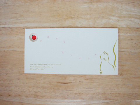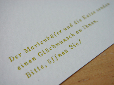 Die gleuckwunsche Karte バースディカード 封筒付き 猫とてんとう虫が届ける誕生日メッセージカードです。ドイツ語で猫は"die Katze"(カッツェ)、てんとう虫は"der Marienkeapher"(マリエンケーファー)と言います。「誕生日おめでとう!」は"Alles Gute zum Geburtstag!"(アレスグーテ ツム ゲバーツターク)。実験も含め飛んでいる配置の日本語を斜めに印刷し、てんとう虫も活字の組み合わせ。樹脂の使用は猫のみ。表面の印刷回数は4回で、手差し自動印刷機→手きん→手差し自動印刷機→手きんの順番に印刷しています。