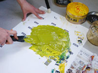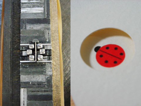 制作ばなし 裏の奥付、封筒印刷まで入れると計6回の印刷!オフセットなどで印刷すれば3回で済むものを、あえて遠い道のりをやってみました。テントウムシの印刷は3人で、印刷する人と運ぶ人で連携作業。小さな所に斜めで位置合わせするのに苦労し、すぐズレて時間がかかってしまいました。穴は一つ一つ手作業で開けています。