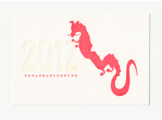 活版によく合う柔らかめのハーフエアに、木活字でメジューム(透明インク)印刷された2012に、龍がつかまるように飛んできています。龍のイラストは切り絵から制作。 龍と活字の赤と、白とのコントラストで、お正月らしい年賀になっています。 紙色:白(コットン:白文字が見えるように、画面上紙の色を暗めにしています。) その他の写真はコチラ→