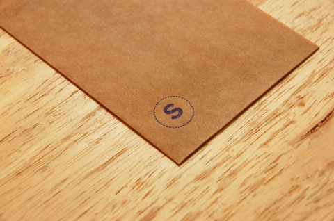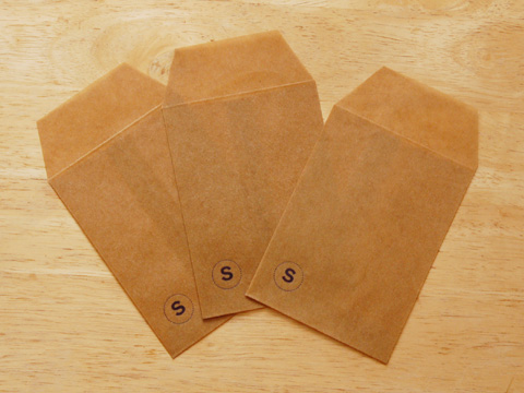 (S) 袋 印の代わりに印刷されていたときに使われた「○」の点活字の中に「S」の活字をいれたシンプルなもの。蝋引きの封筒にしっかりとインクがのって、押しているのもはっきりとわかる、封筒と共に触りたくなるミニ封筒です。